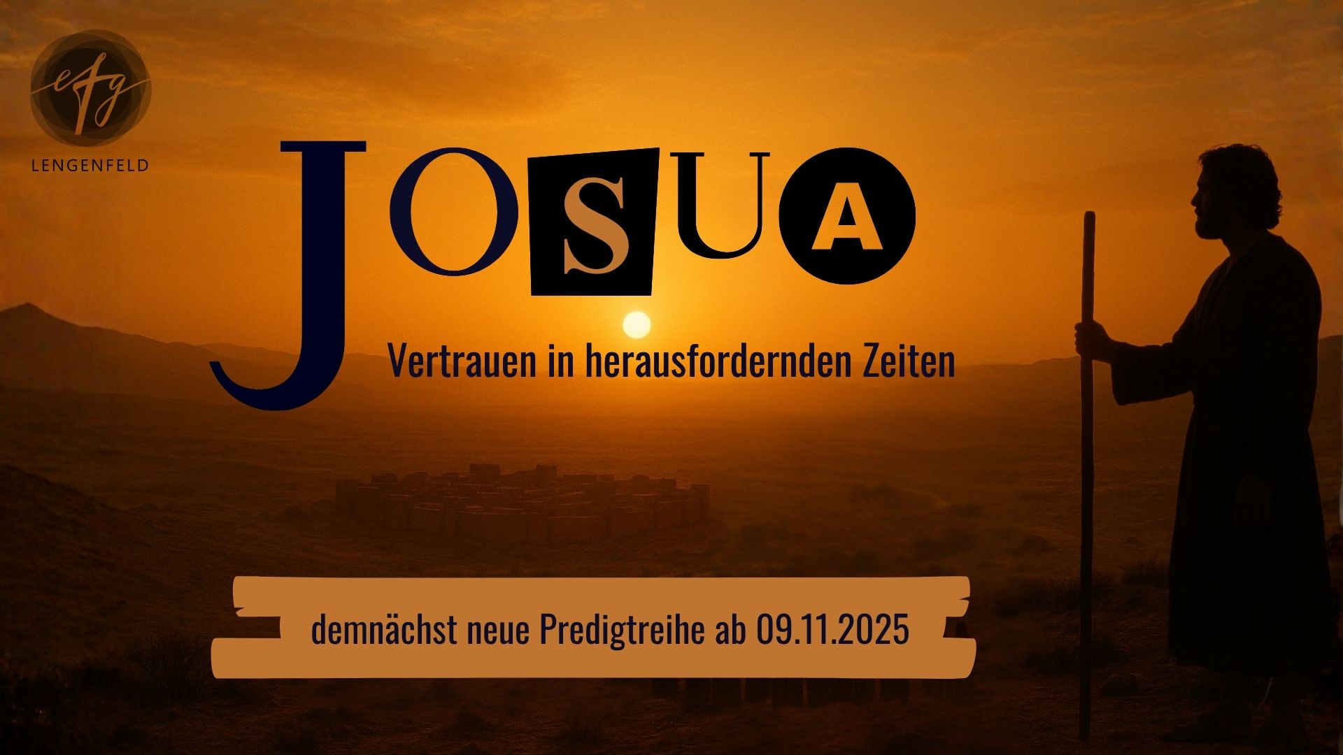 Das Buch Josua erzählt keinen militärischen Eroberungsbericht, sondern eine Geschichte von Glauben, Vertrauen und Treue. Gott erfüllt seine Verheißungen  an sein Volk – Schritt für Schritt, manchmal auf Wegen, die menschlich unmöglich scheinen. Josua ist ein Buch über Übergänge: vom Alten ins Neue, von der Wüste ins Land, von der Verheißung in die Erfüllung. Und genau in solchen Übergängen leben auch wir. Wir sind gespannt auf diese Reihe und wie Gott jedem von uns begegnen wird.